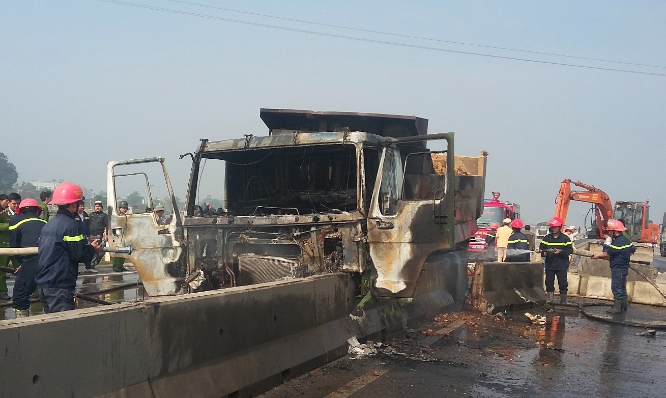 Giao thông qua đoạn đường này bị ùn tắc suốt hơn 1 giờ trong khi xe tải gặp tai nạn bị lửa thiêu rụi phần cabin.