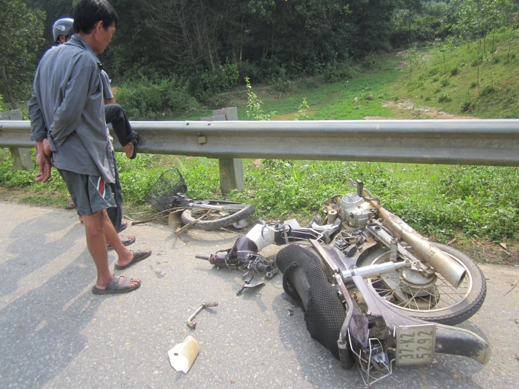 Cú đâm cực mạnh làm xe máy bị gãy đôi, nhiều bộ phận bị hư hỏng hoàn toàn. Sau cú tông, xe tải tiếp tục lao xuống vực khiến hai tài xế bị thương nặng. Nạn nhân được đưa vào viện cấp cứu trong tình trạng nguy kịch.