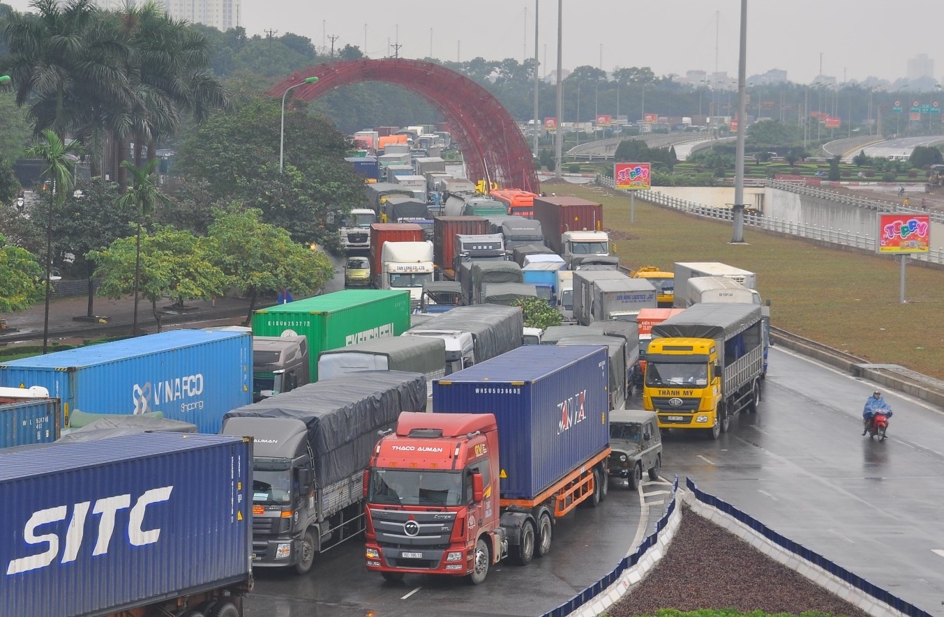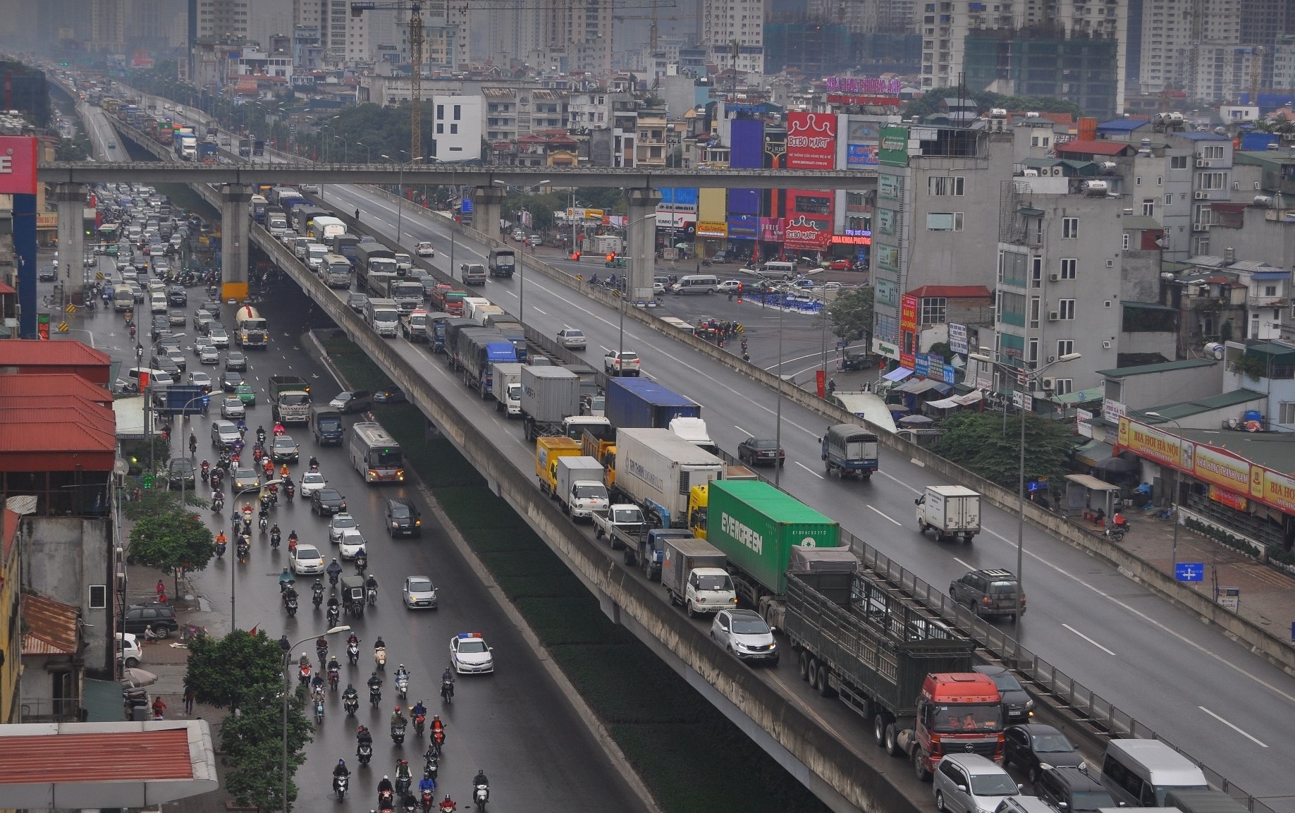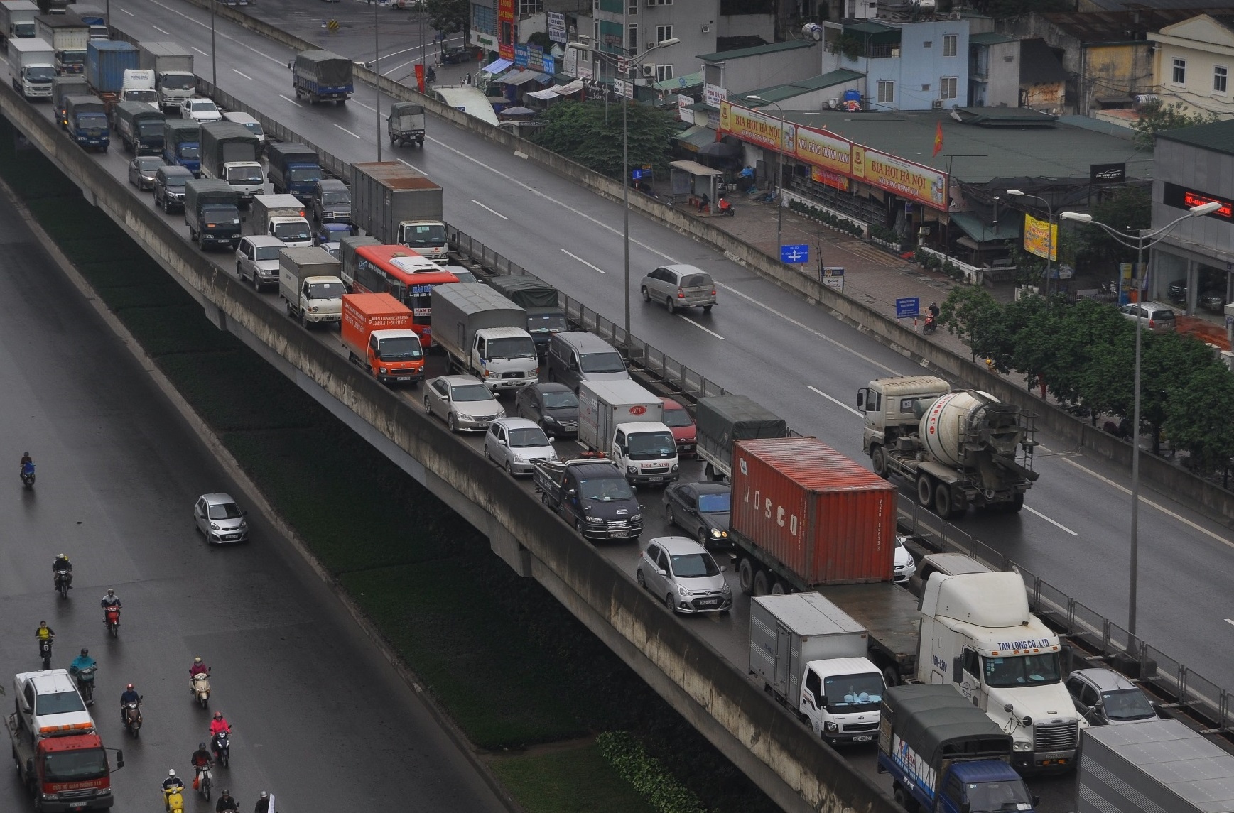 | Hàng trăm ôtô đi từ bến xe Mỹ Đình, đại lộ Thăng Long hướng ra quốc lộ 1A chôn chân ở đường trên cao nhiều giờ. |