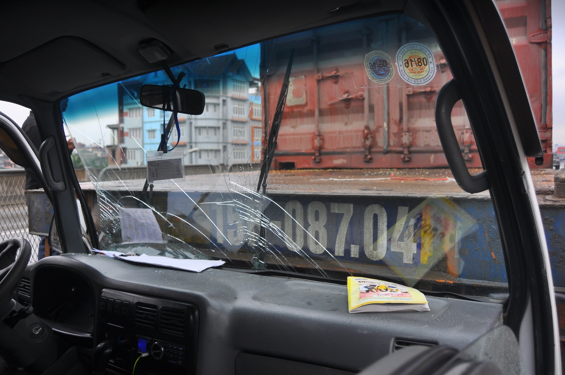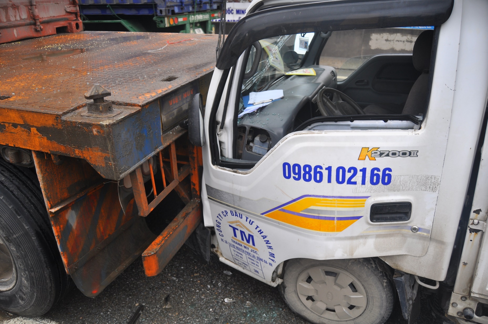 | Còn anh Đỗ Xuân Trang (22 tuổi, quê Nam Định) cho hay, xe anh đâm trúng container đeo biển kiểm soát Hải Phòng. Cú va chạm mạnh khiến anh va đầu trúng vô lăng chảy máu. Toàn bộ kính hai cửa vỡ vụn, rơi xuống lòng đường. Kính chắn gió phía trước rạn nứt. "Cánh cửa mắc kẹt, tôi được nhiều tài xế, phụ xe khác kéo ra ngoài", anh nói. |