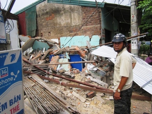 | Vụ tai nạn làm phần cửa, tường và mái của quầy hàng sửa chữa điện thoại bị sập đổ, nhiều máy tính, điện thoại, linh kiện bị hư hỏng. Ảnh: Văn Được. |