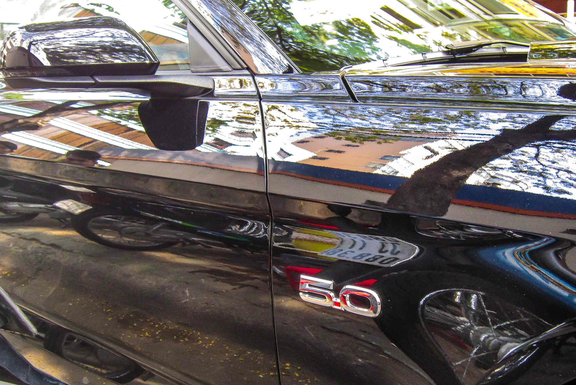 | Bên hông, huy hiệu 5.0 chỉ dung tích máy được mạ chrome khá nổi bật. Mặc dù dung tích lớn, Mustang GT chỉ tiêu hao 9,41 lít/100 km trên xa lộ, 15,68 lít/100 km trong thành phố. Mức tiêu hao trung bình là 12,38 lít/100 km, khá thấp so với một chiếc xe cơ bắp của Mỹ. |