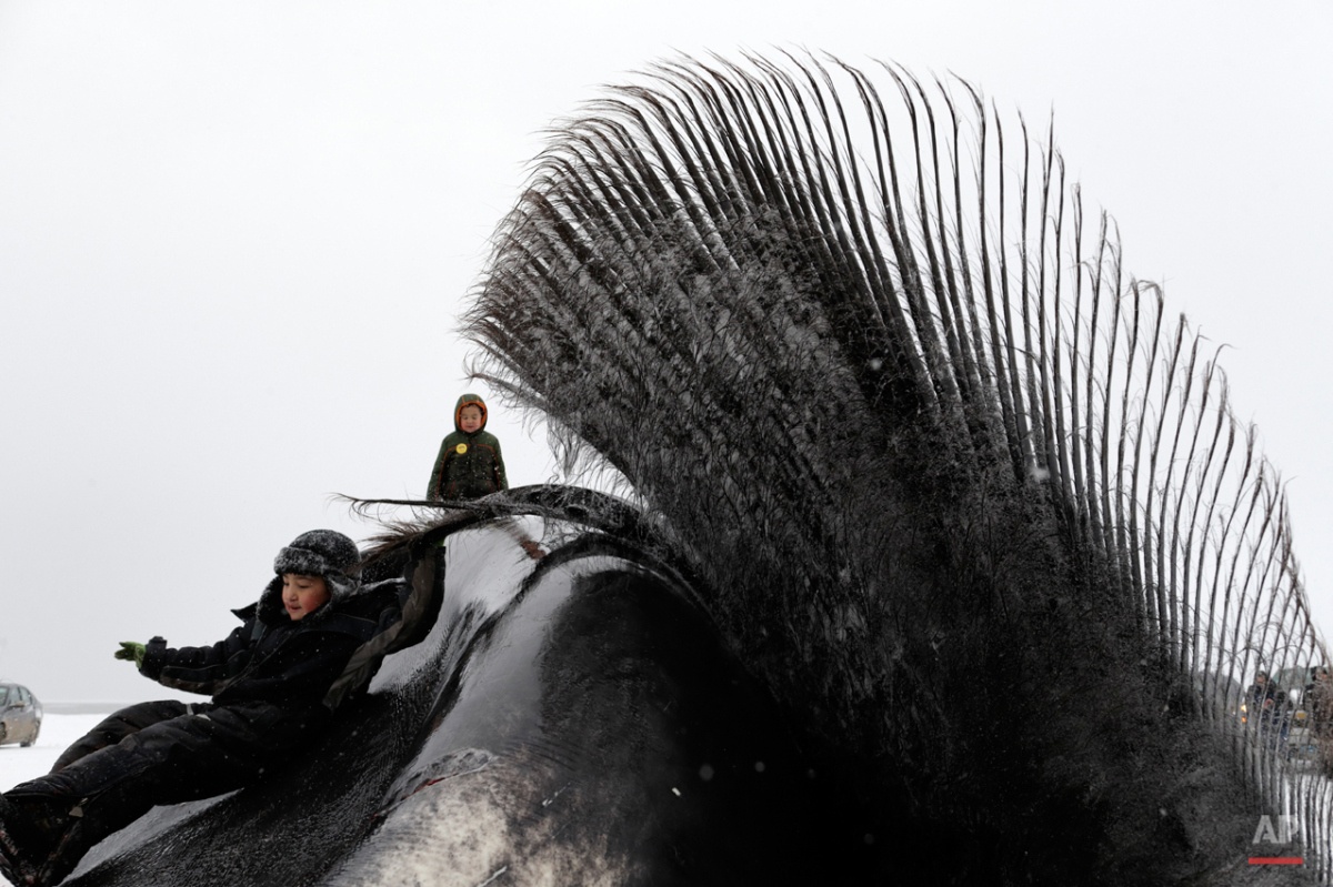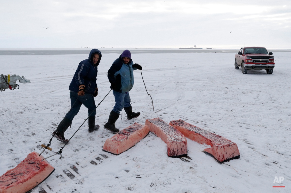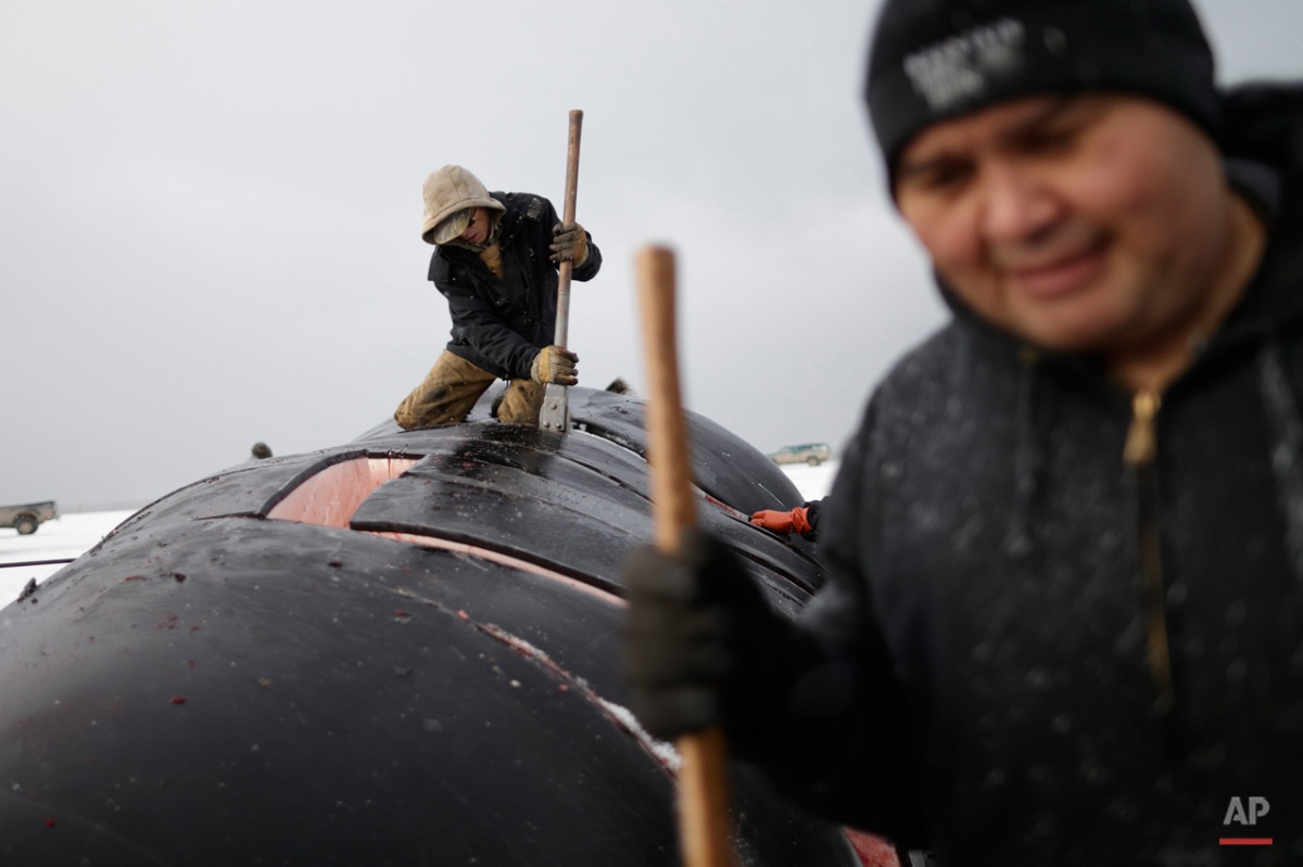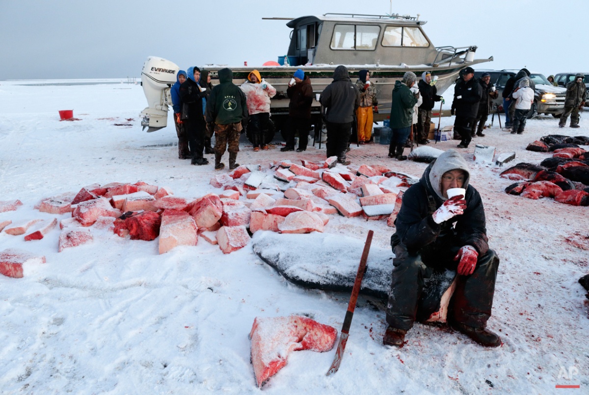 Thịt và mỡ của con vật khổng lồ đã sẵn sàng để chia cho các gia đình. Nó là nguồn thực phẩm quan trọng của họ trong mùa đông khắc nghiệt ở Alaska. |