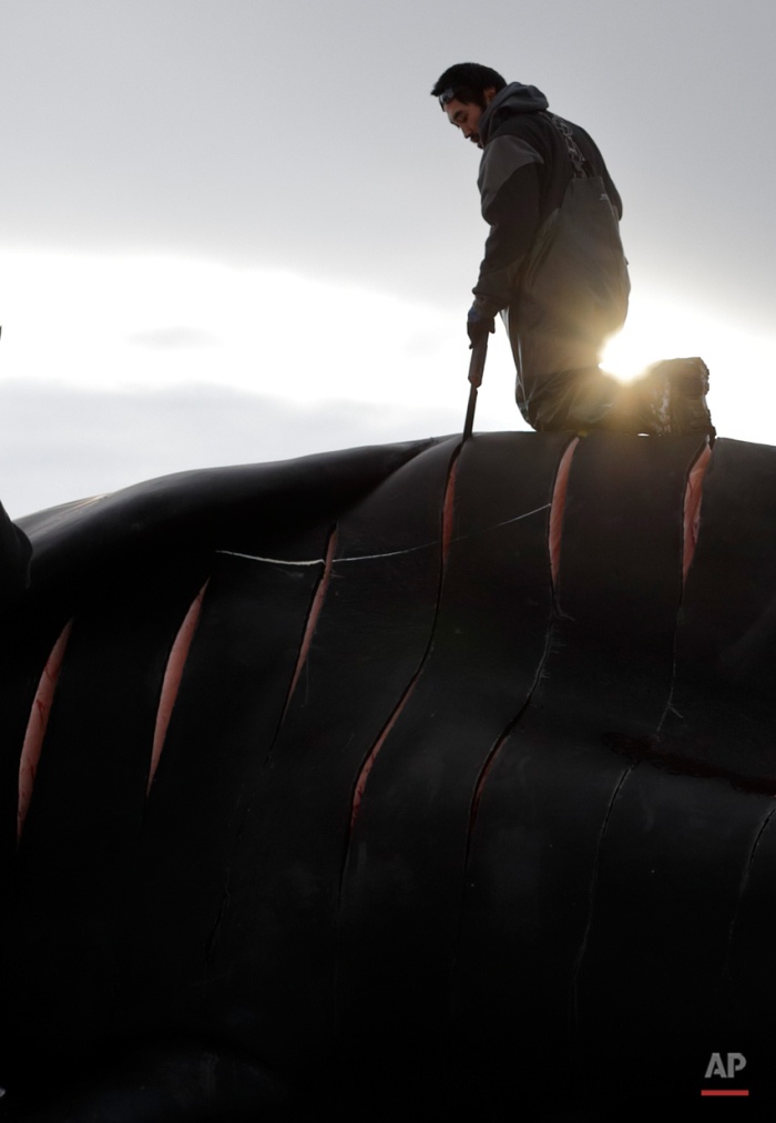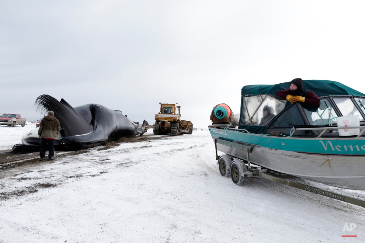 Sau khi giết chết con mồi, người ta sử dụng máy cơ giới hạng nặng để kéo nó lên bờ trước khi xẻ thịt. Chiếc thuyền máy nằm bên cạnh chính là công cụ mà người dân ở Barrow sử dụng để đánh bắt cá voi. Thông thường, họ phải vật lộn nhiều giờ với con vật trước khi đưa được nó lên bờ. |