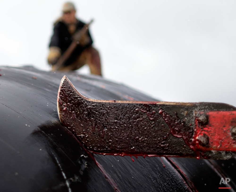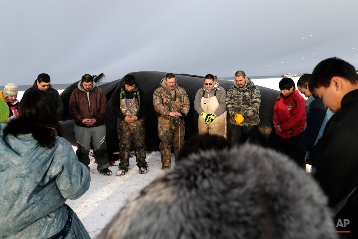 Trước khi xẻ thịt cá voi, người ta cầu nguyện vì Chúa đã ban cho họ món quà này. Khối thịt khổng lồ từ con cá voi sẽ giúp đảm bảo cuộc sống cho người dân ở vùng đất lạnh giá. |
