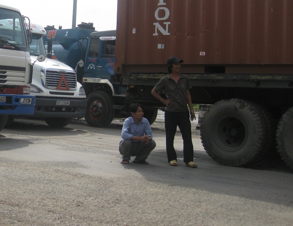 | Chờ đợi quá lâu, hai tài xế xuống đường trốn nắng. |