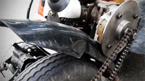 | Động cơ của chiếc xe được làm từ động cơ của một chiếc máy cắt cỏ cũ. Bình xăng có sức chứa khoảng 330 ml. |
