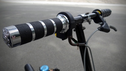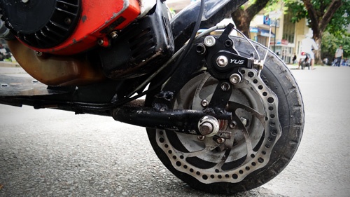 | Bánh xe tuy nhỏ nhưng là loại có ruột hơi, được gắn thêm thắng đĩa của xe đạp để đảm bảo an toàn. |