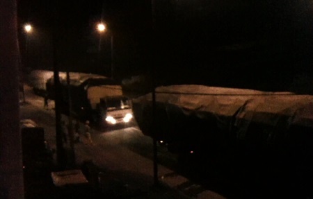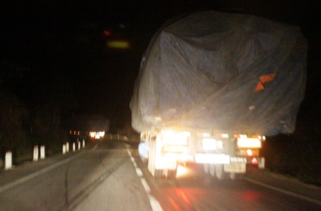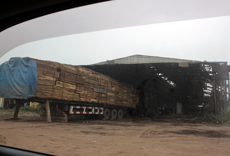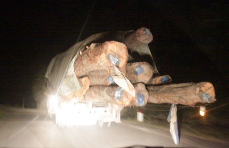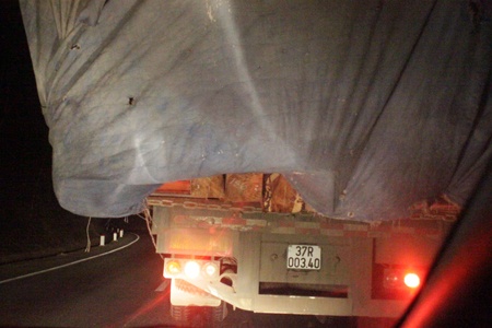 | Đoàn xe gồm 4 xe tải, loại 6 trục lầm lũi bò trên đường, dù được ngụy trang nhưng vẫn đễ nhận ra bên trong chất đầy gỗ hộp nặng cả trăm tấn. |