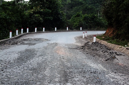 | Một trong số nhiều đoạn trên QL 15D nối Đường Hồ Chí Minh nhánh Tây với Cửa khẩu La Lay, đã bị xe chở gỗ phá nát hoàn toàn. |