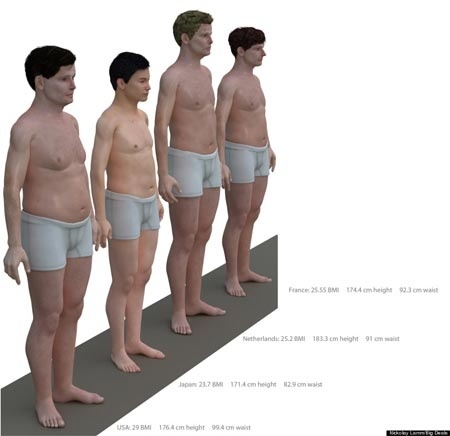 Theo thống kê, chỉ số BMI trung bình của một nam giới Mỹ là 29, chỉ cách mức béo phì 1 điểm. Trong khi đó, chỉ số này ở đàn ông Hà Lan là 25,2 và đàn ông Pháp là 25,55, bắt đầu được xếp vào mức dư cân. Đàn ông Nhật có BMI trung bình là 23, hiện vẫn trong mức bình thường.