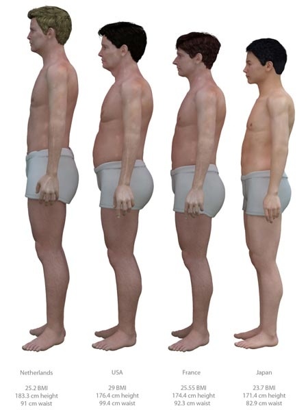 | Xét theo chỉ số BMI, chỉ có đàn ông Nhật sở hữu cơ thể bình thường, đàn ông Pháp và Hà Lan bắt đầu được xếp vào mức dư cân, còn đàn ông Mỹ chỉ cách ngưỡng béo phì 1 điểm. |