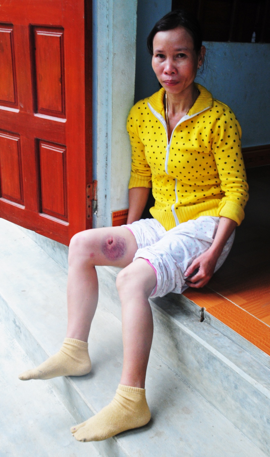 | Chị Đinh Thị Kiều (ngụ thị trấn La Hà, huyện Tư Nghĩa) bị pháo hoa rơi trúng gây bỏng chân. Ảnh: Minh Hoàng. |