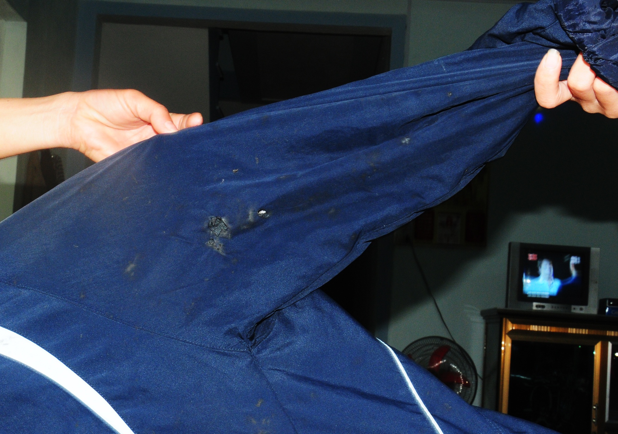 | Áo khoác của anh Nguyễn Văn Trung (ngụ thị trấn La Hà, huyện Tư Nghĩa) bị pháo hoa rơi trúng gây nhiều vết thủng cháy đen. Ảnh: Minh Hoàng. |