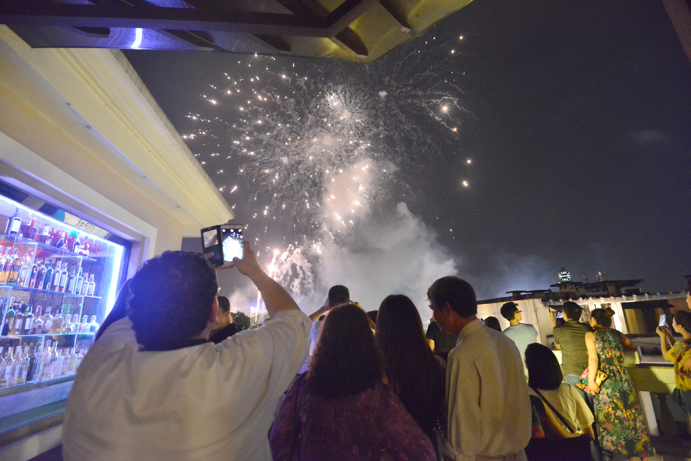 | Khách hàng tại quán bar tận hưởng góc nhìn đẹp ngắm pháo hoa. Ảnh: Hoàng Anh. |