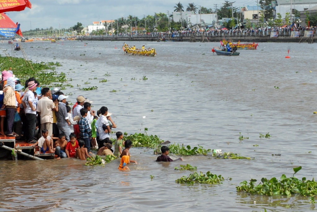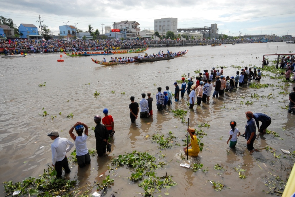 | Hàng trăm người phải dầm mình xuống sông để theo dõi các đội ghe ngo tranh tài. |