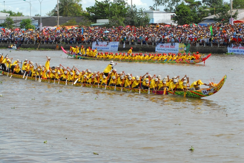 | Ghe ngo là một dạng ghe đặc biệt, được xem là vật thiêng chỉ được dùng để đua. Ghe ngo là thuyền độc mộc làm bằng thân nguyên vẹn của cây gỗ sao, được khoét phần ruột, do nghệ nhân và các sư chùa Khmer làm. Ghe ngo dài từ 25 - 30m, rộng 1 - 1,4m, có 20 - 40 khoang, chứa 44 - 50 tay bơi. |