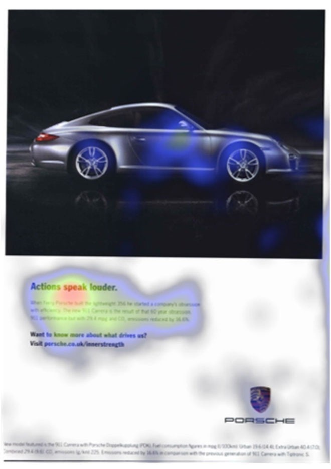 Trong quảng cáo này, người xem không để ý đến chiếc xe Porsche được quảng cáo. Thay vào đó, họ đọc thông tin bên dưới. |