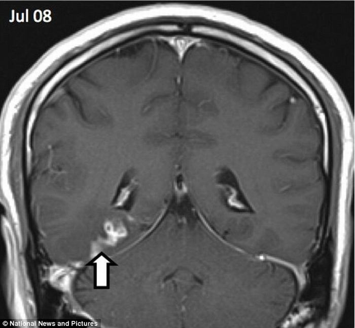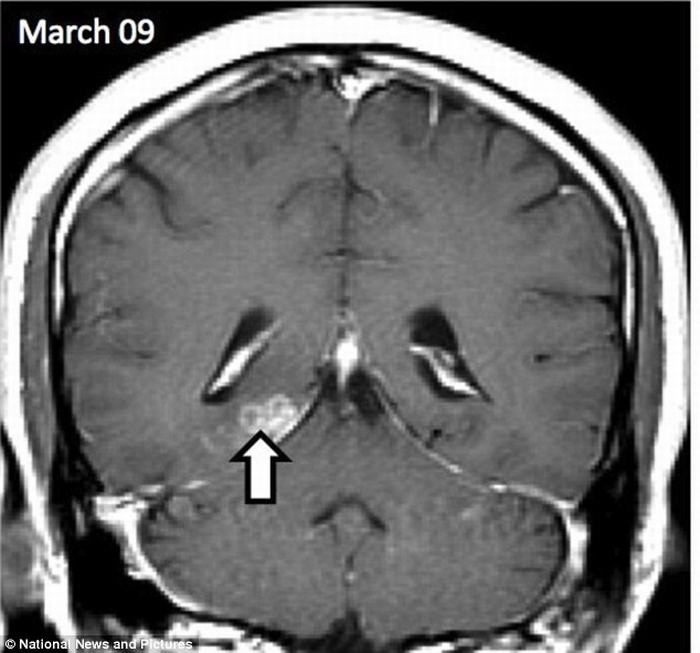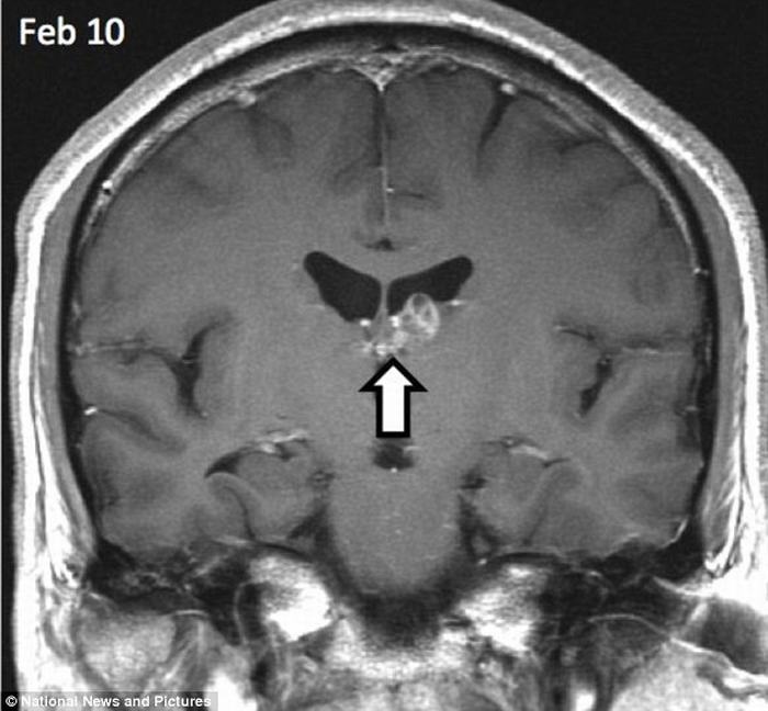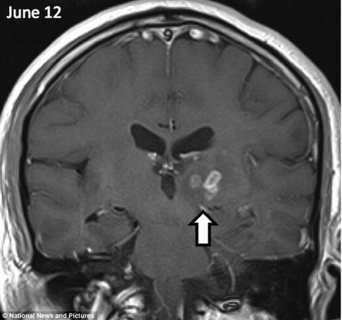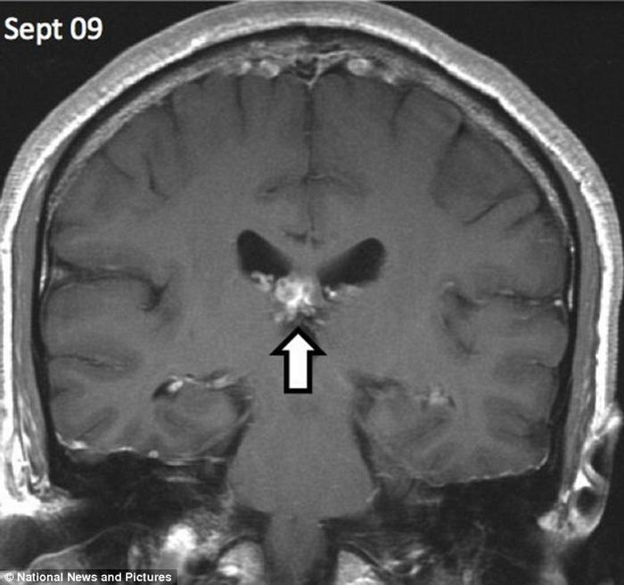 | Con sán đã ‘du lịch’ khoảng 5cm từ phía bên phải sang bên trái của não người đàn ông này trong suốt 4 năm. |