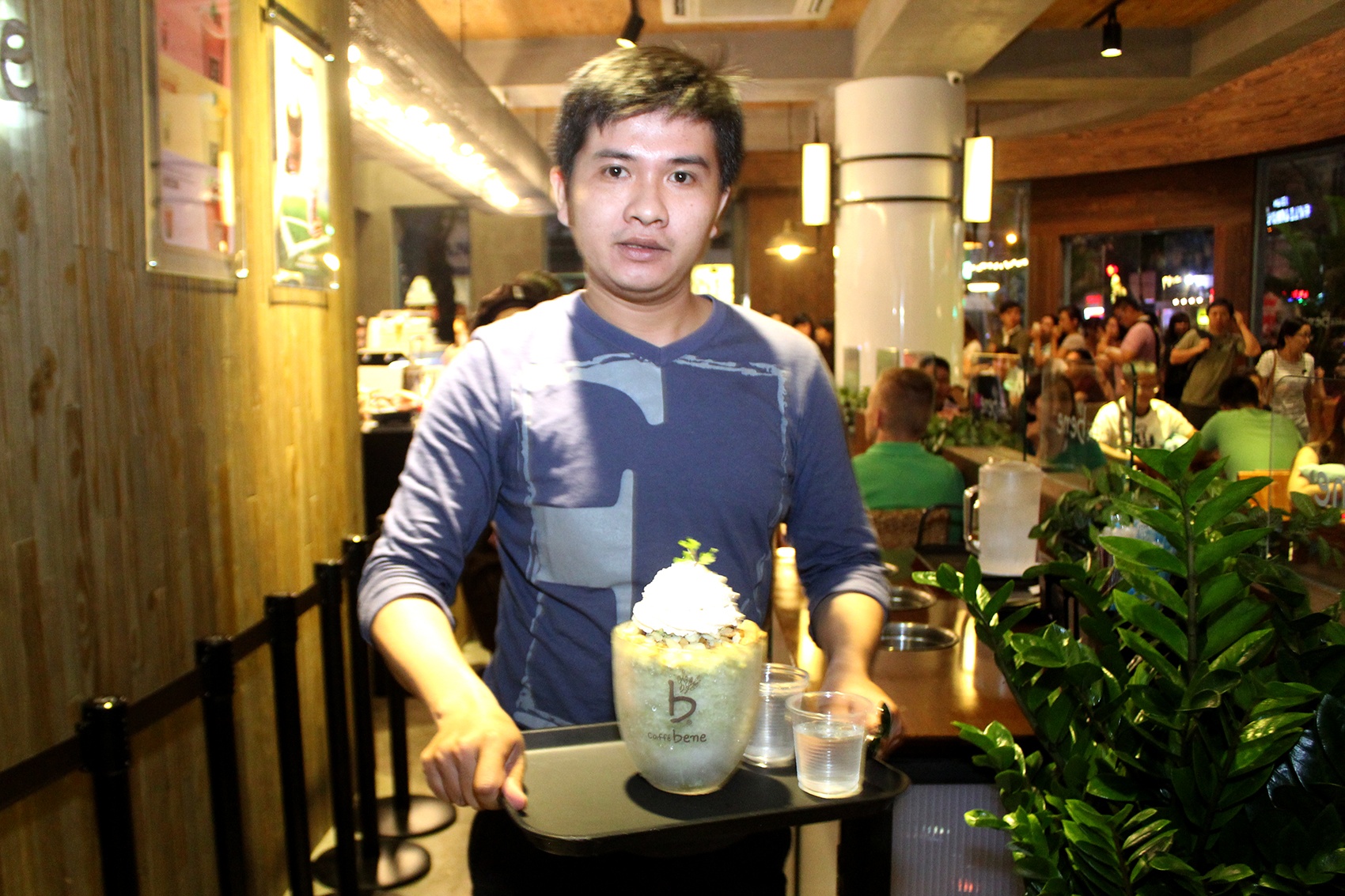 | Dù mở cửa tại TP.HCM cả tuần nay tại đường Đồng Khởi, quận 1, nhưng cơn sốt uống cho bằng được ly cà phê Hàn Quốc của nhiều bạn trẻ Sài Gòn vẫn nóng. Chiều tối 30/8, dòng người nườm nượp đổ về quán Caffe Bene để xếp hàng chờ đến lượt được mua cà phê đến từ xứ sở "kim chi". |