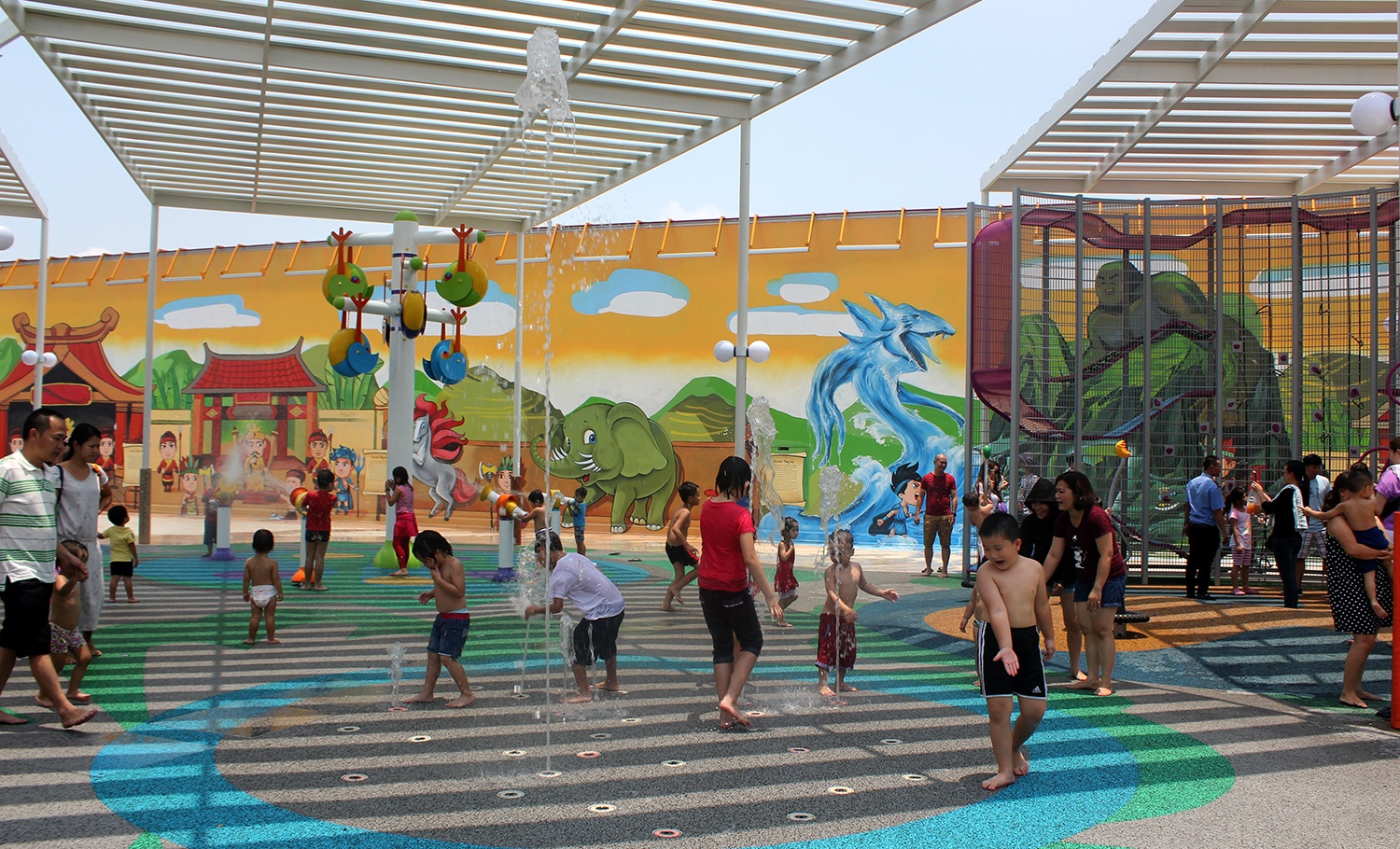Khung cảnh tại khu vui chơi ướt ngoài trời miễn phí dành cho trẻ em dưới 12 tuổi.