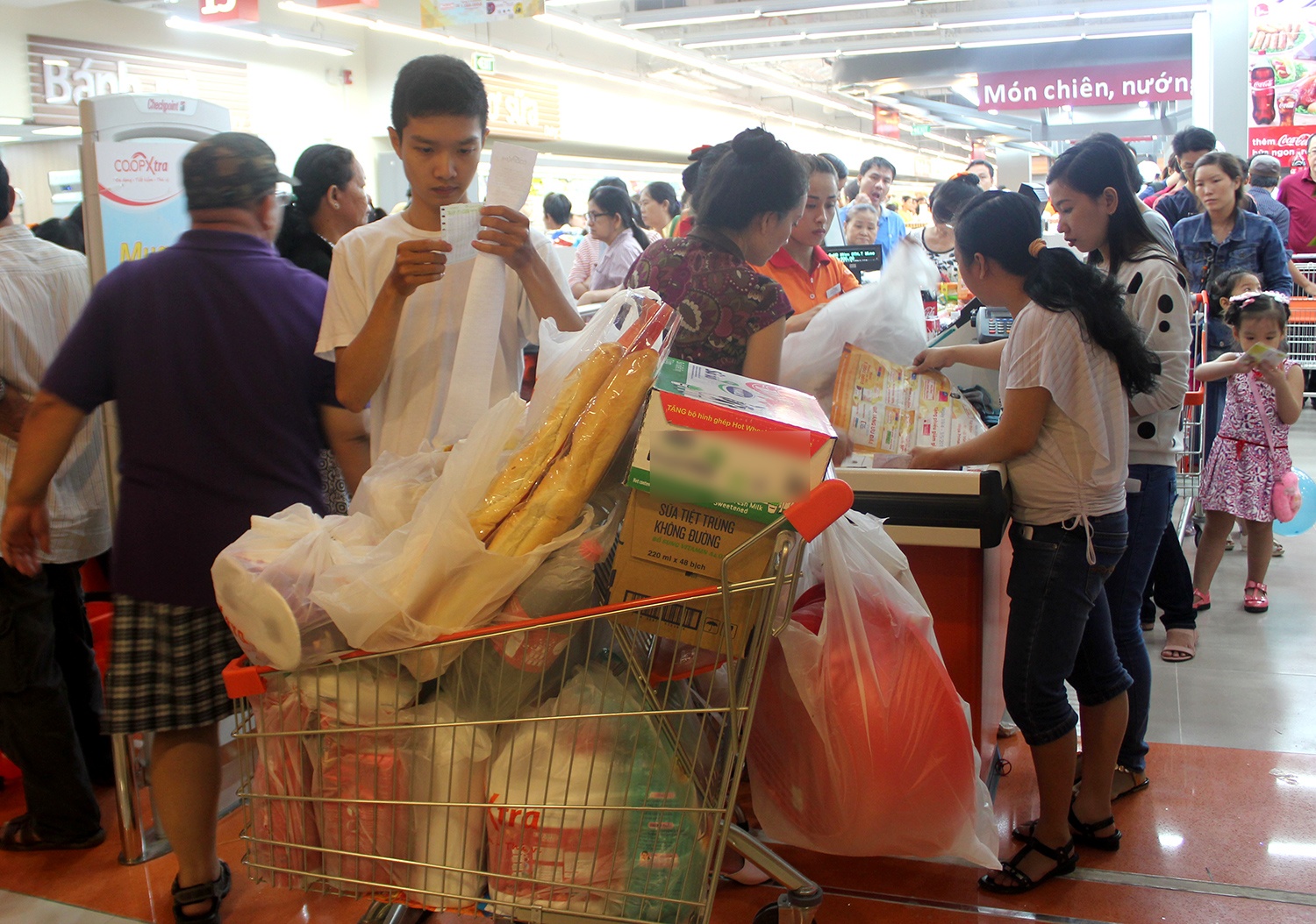 | Nhân dịp khai trương, siêu thị giảm giá hàng trăm mặt hàng gia dụng và thực phẩm. Khách rất đông, phải xếp hàng chờ thanh toán.