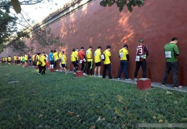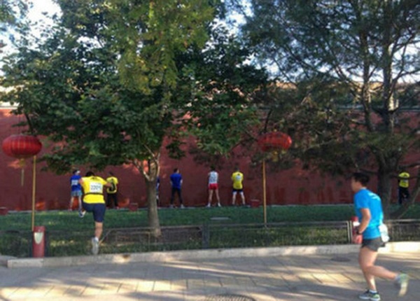 Chùm ảnh về những người tham gia cuộc thi chạy marathon Bắc Kinh 2013 đứng úp mặt vào bức tường của Tử Cấm Thành để tiểu tiện đã gây ra một làn sóng phẫn nộ trên mạng.