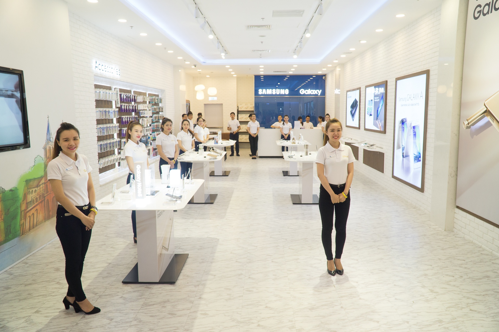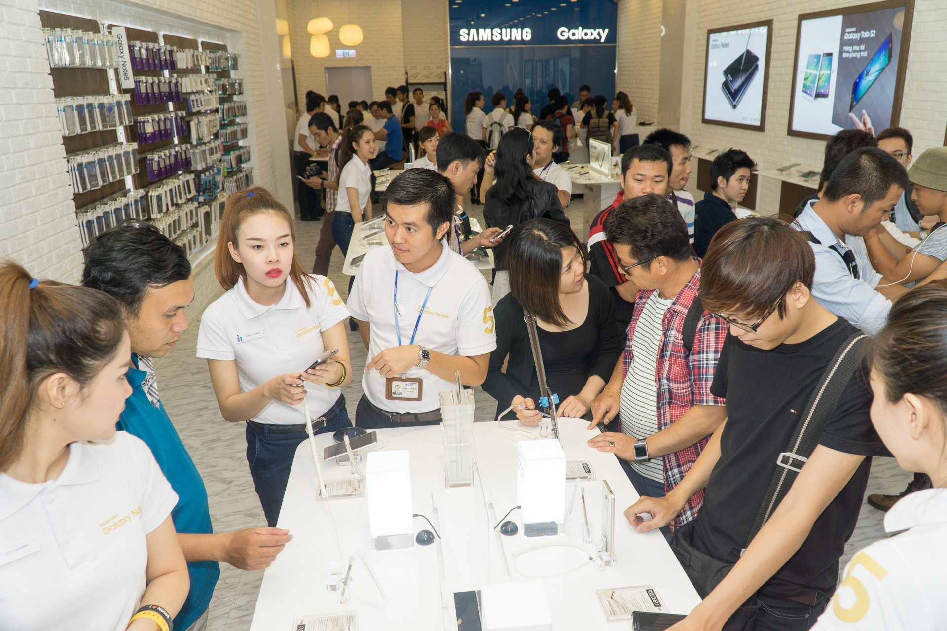 Cửa hàng tại TP HCM mở cửa muộn hơn, tuy nhiên nhân viên của Samsung đã chuẩn bị từ sớm, sẵn sàng tư vấn và bán hàng.