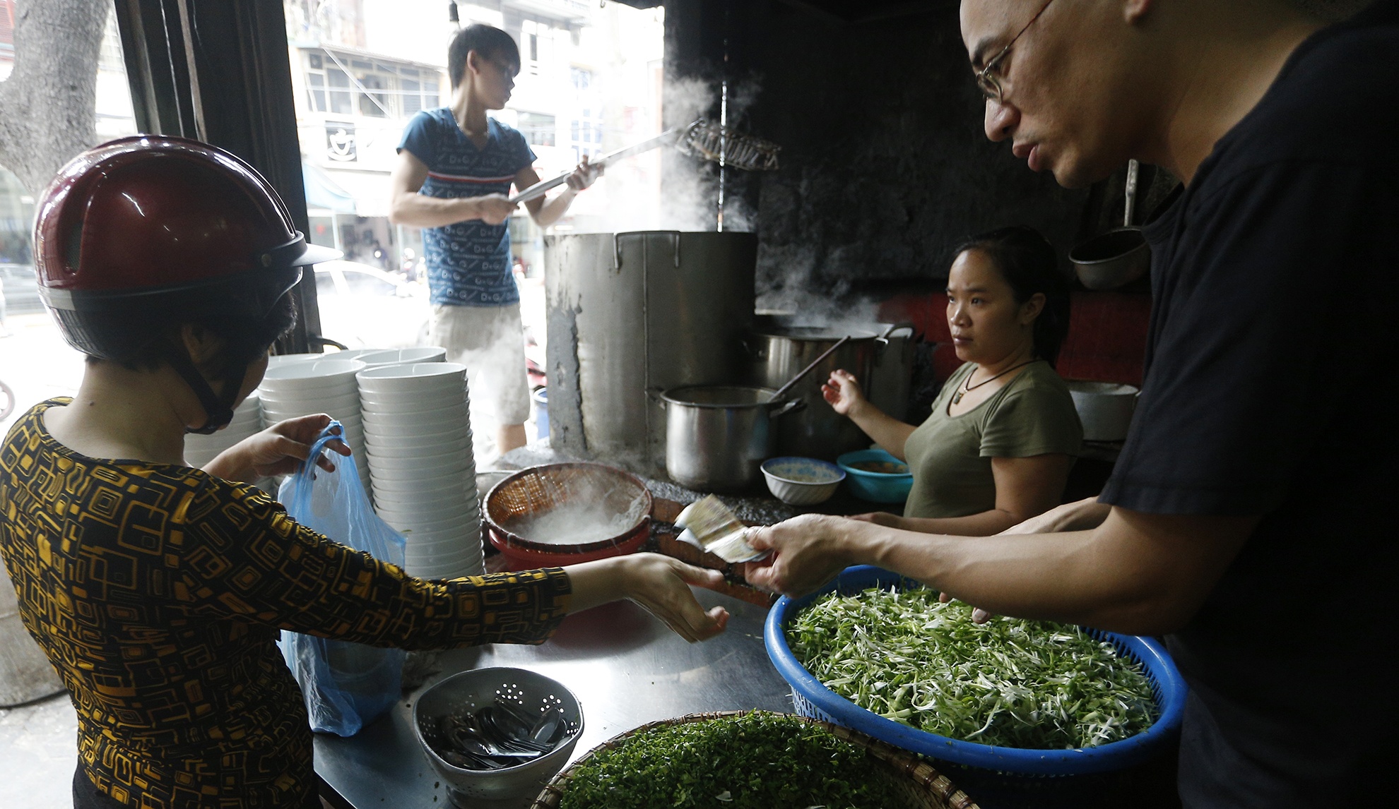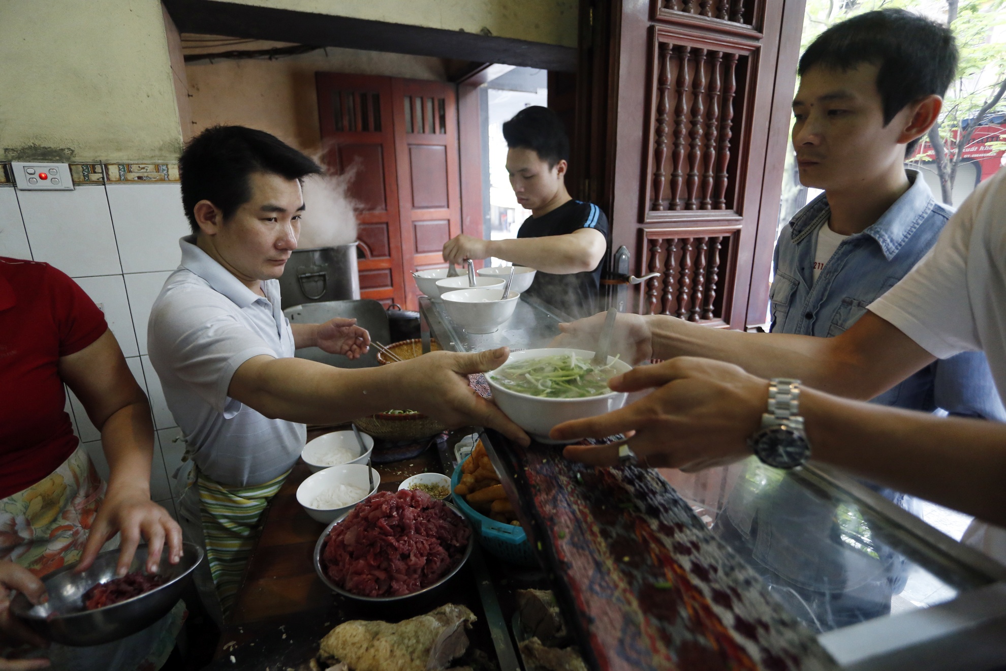 Xếp hàng, tự bê, trả tiền trước để ăn phở giá cao ở Hà Nội