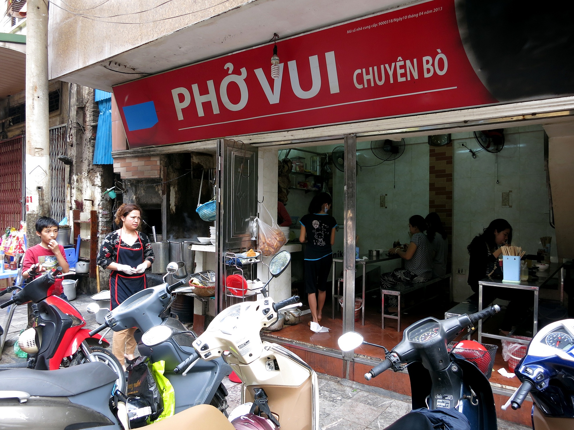 Hàng phở trên phố Hai Bà Trưng từng chỉ bán vỉa hè nhưng giá cao vọt so với các quán phở thông thường. Mới đây, chỗ ngồi của khách đã được chuyển vào trong nhà nhưng rất chật chội.