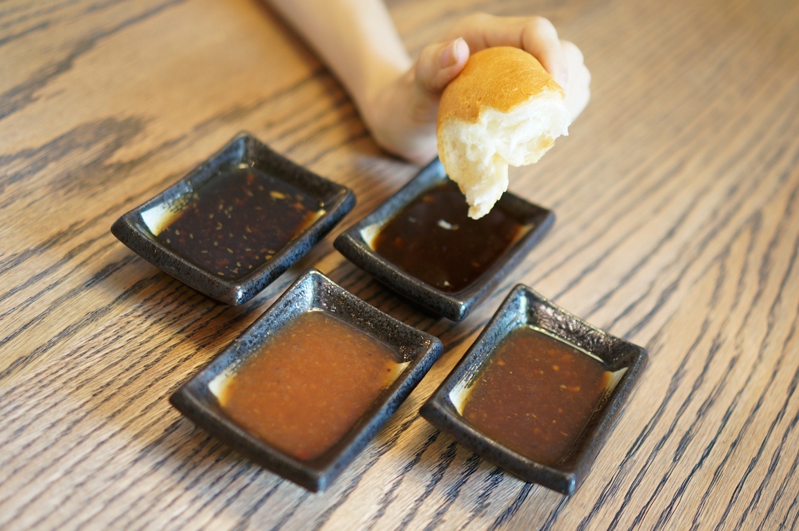 | Nếu gọi bánh mì, bạn sẽ được nhà hàng chiêu đãi 4 loại sốt để ăn kèm. |