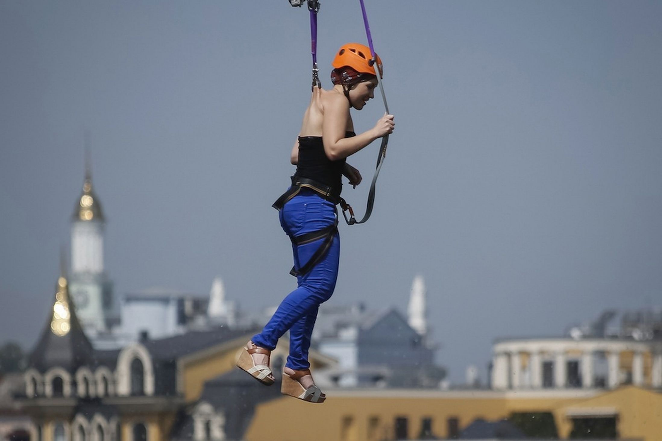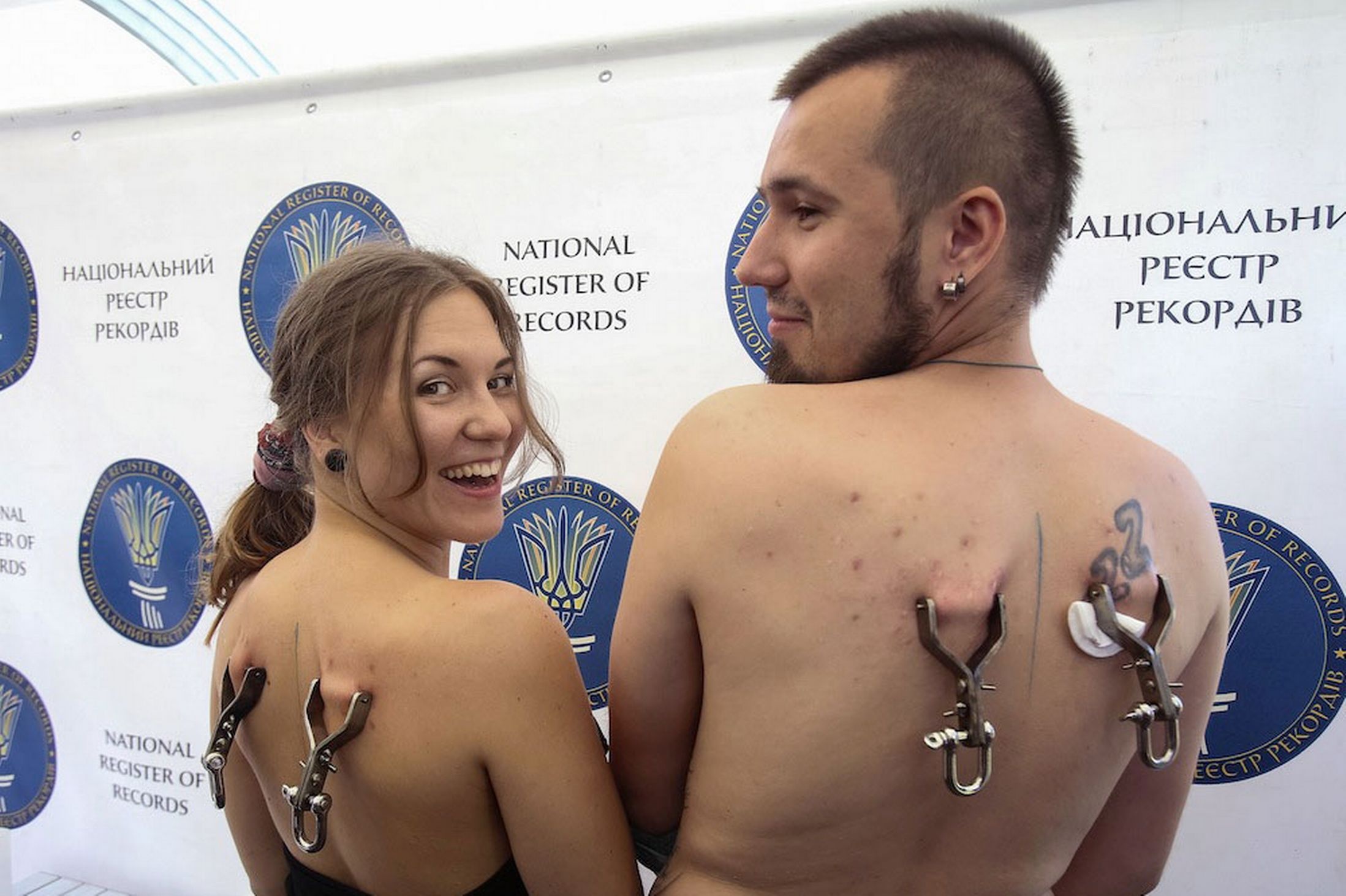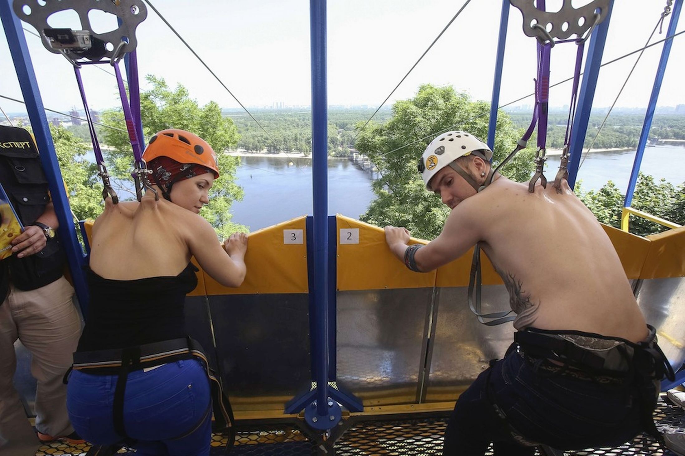 Cô Mariya Gafitsa (23 tuổi) và anh Pavlo Klets (24 tuổi) trình diễn màn đu dây vượt sông đầy nguy hiểm bằng cách đâm thanh kim loại xuyên qua lưng. |