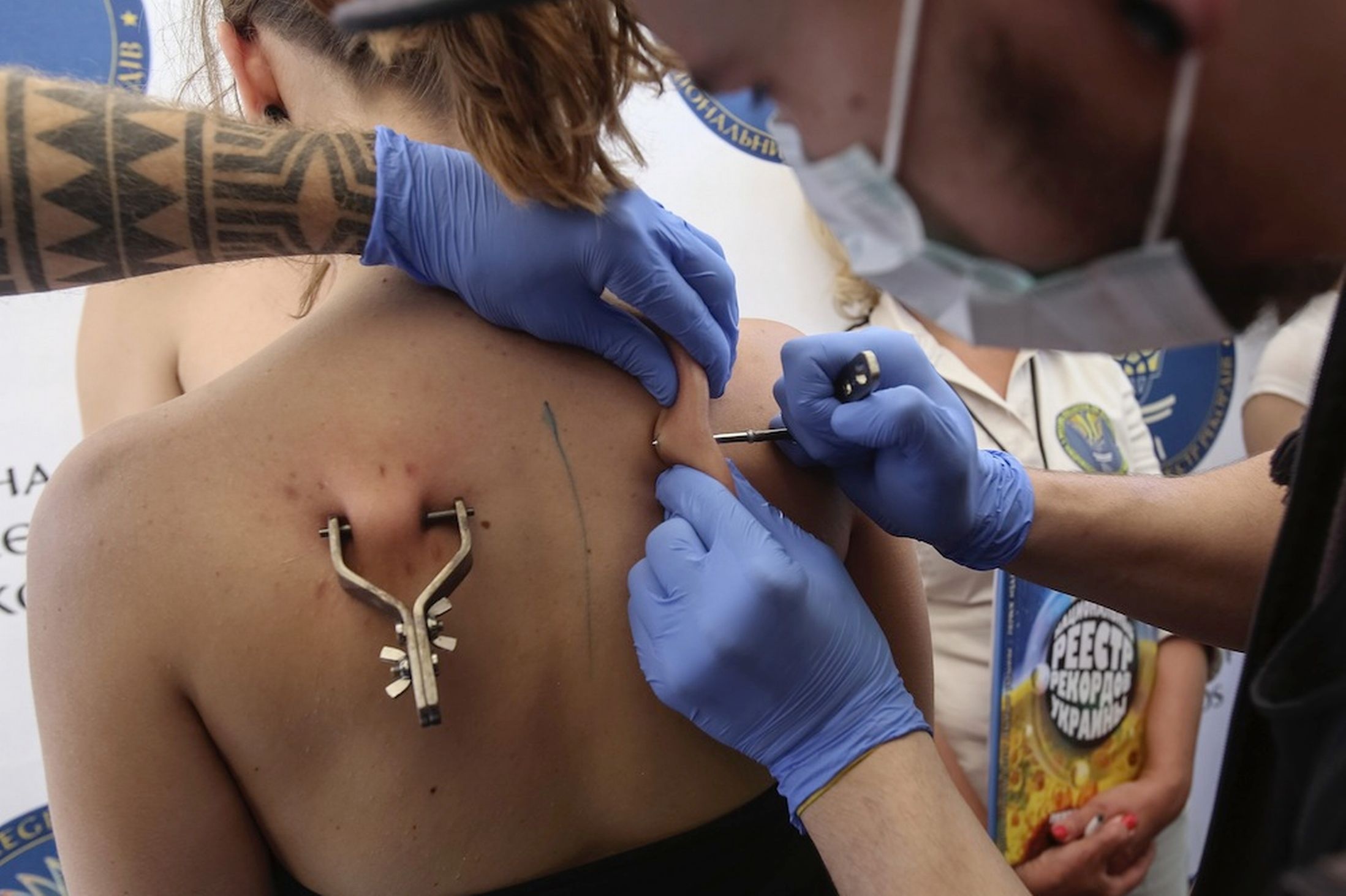 | Một số người đâm thanh kim loại xuyên qua vùng da lưng của hai người trong công đoạn chuẩn bị. |