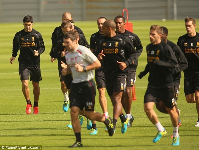 | Suarez cười đùa cùng các đồng đội ở Liverpool. |