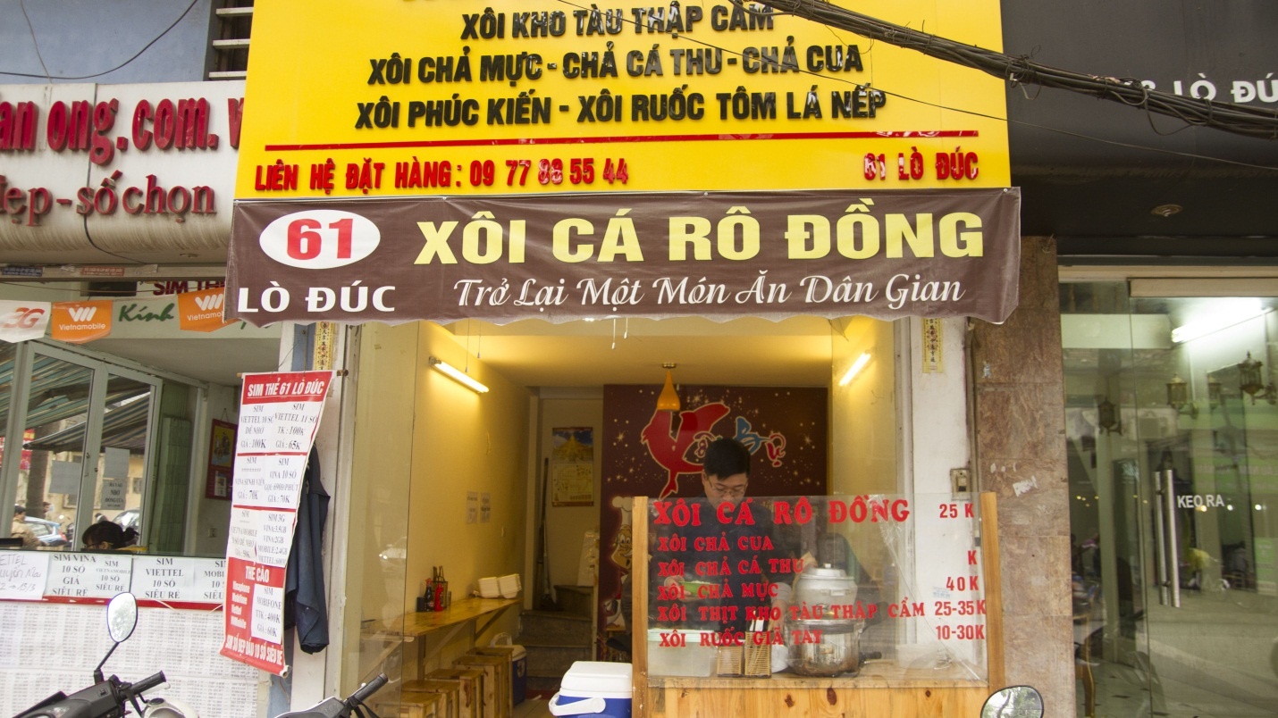 Độc đáo nhất phải kể đến món xôi cá rô đồng chỉ có thể tìm thấy tại Xôi Bự - 61 Lò Đúc. Xôi cá rô đồng là món ăn dân gian của người dân Hà thành cũ, nay chỉ còn số ít người biết tới. Để làm món này, người nấu cần bỏ rất nhiều công sức từ khâu chọn thực phẩm tới khâu chế biến. Gạo nếp được dùng là nếp cái hoa vàng ngâm 3 tiếng trước khi nấu. Cá rô đồng phải chọn những con to, khỏe, béo vàng. Cá được sơ chế, khử tanh và cho vào hấp chín tới. Cá chín vớt ra để nguội, bóc lấy thịt, rút hết xương và tẩm ướp gia vị. Cuối cùng, cá được đem xào nhanh tay với hành hoa để dậy mùi thơm bùi. Với cách chế biến cầu kỳ khác hẳn cách chế biến các loại xôi thông thường, xôi cá rô đồng đã chinh phục được những vị khách khó tính nhất.