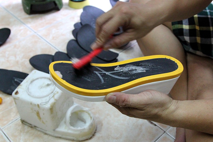 | Theo những người làm nghề này, bôi keo là công đoạn quan trọng nhất đòi hỏi người thợ phải tỉ mỉ từng tí một. Người phụ trách khâu này phải là thợ lành nghề, có kinh nghiệm, vì nếu sử dụng lượng keo không đủ sẽ ảnh hưởng đến độ bền, nhưng keo được sử dụng quá nhiều sẽ làm mất thẩm mỹ sản phẩm. |