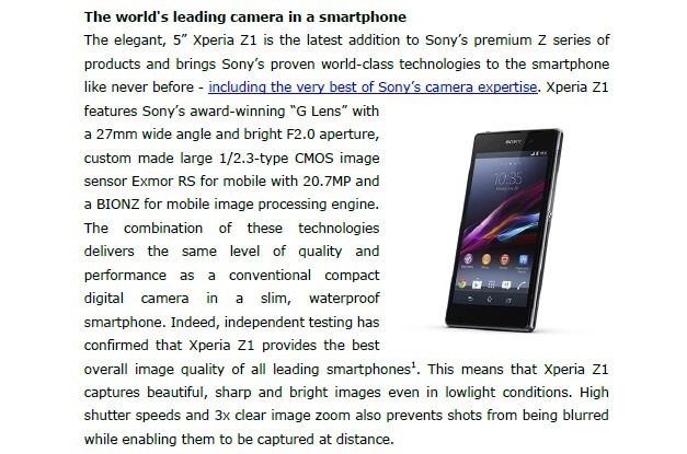 Trang Xperia Blog vừa đăng tải những hình ảnh chụp lại thông cáo báo chí của Sony. Theo đó, Xperia Z1 (Honami) sẽ xử dụng chip lõi tứ 2,2 GHz của Qualcomm, chip đồ họa Adreno 330, RAM 2GB, camera 20,7 MP. Máy có màn hình 5 inch độ phân giải 1.080 x 1.920, sử dụng công nghệ Triluminos và X-Reality For Mobile. Pin dung lượng 3.000 mAh.