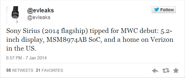 Thông tin cho biết Sirius sẽ là tên mã của Z2 cùng với một màn hình hiển thị 5,2 inch, độ phân giải ấn tượng 2.560 x 1.440 pixel. Ngoài ra, thiết bị này được cho là sẽ được trang bị camera 20,7 megapixel, thiết kế siêu mỏng và có khả năng chống nước, bụi và dung lượng pin lên tới 3.700 mAh. Thế hệ tiếp theo của Z1 cũng sẽ được trang bị công nghệ Mobile Bravia Engine 3 nhằm nâng chất lượng xử lý và hiển thị hình ảnh.