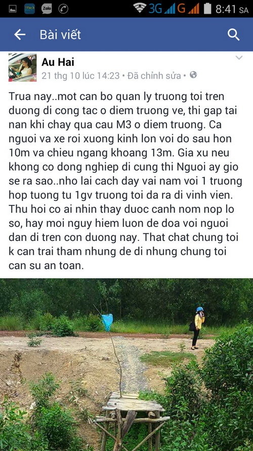 Nguyên văn cô Âu viết: “Trưa nay… một cán bộ quản lý trường tôi trên đường đi công tác ở điểm trường về, thì gặp tai nạn khi chạy qua cầu M3 ở điểm trường. Cả người và xe rơi xuống kinh lớn với độ sâu hơn 10m và chiều ngang khoảng 13m. Giả xử nếu không có đồng nghiệp đi cùng thì người ấy giờ sẽ ra sao… Nhớ lại cách đây vài năm với 1 trường hợp tương tự 1 giáo viên trường tôi đã ra đi vĩnh viễn.