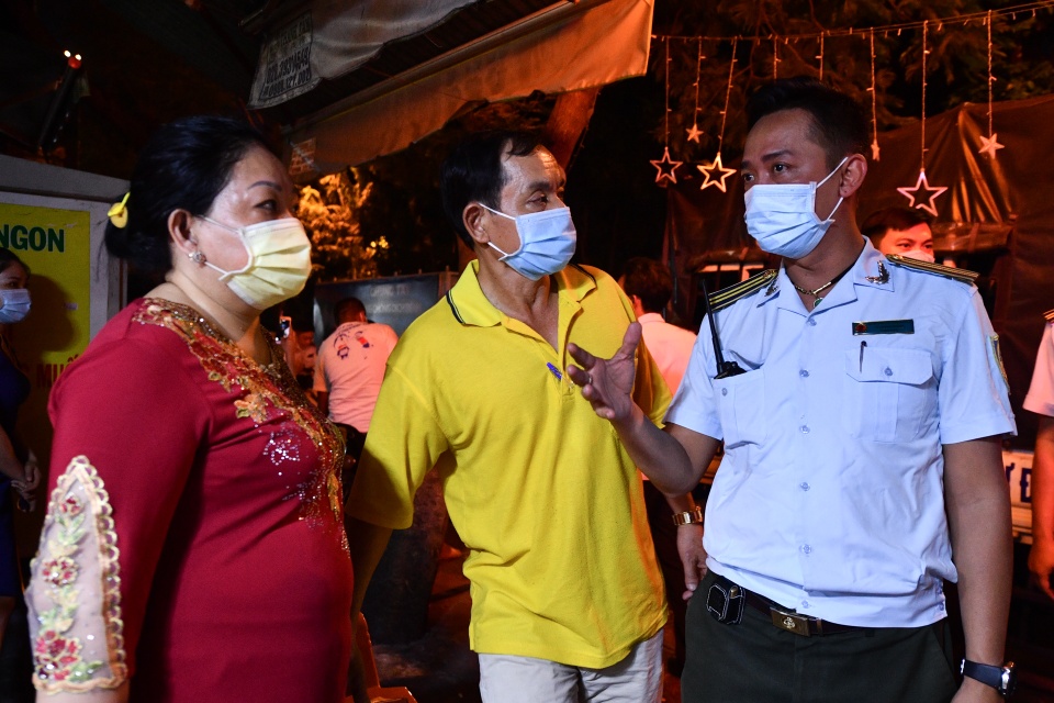 | Tối 17/2, lực lượng chức năng phường 17 (quận Phú Nhuận, TP.HCM) phối hợp cùng Đội Quản lý trật tự Đô thị ra quân nhắc nhở, tuyên truyền về việc đóng cửa quán nhậu để tránh tụ tập đông người. |