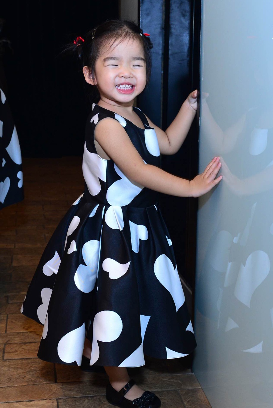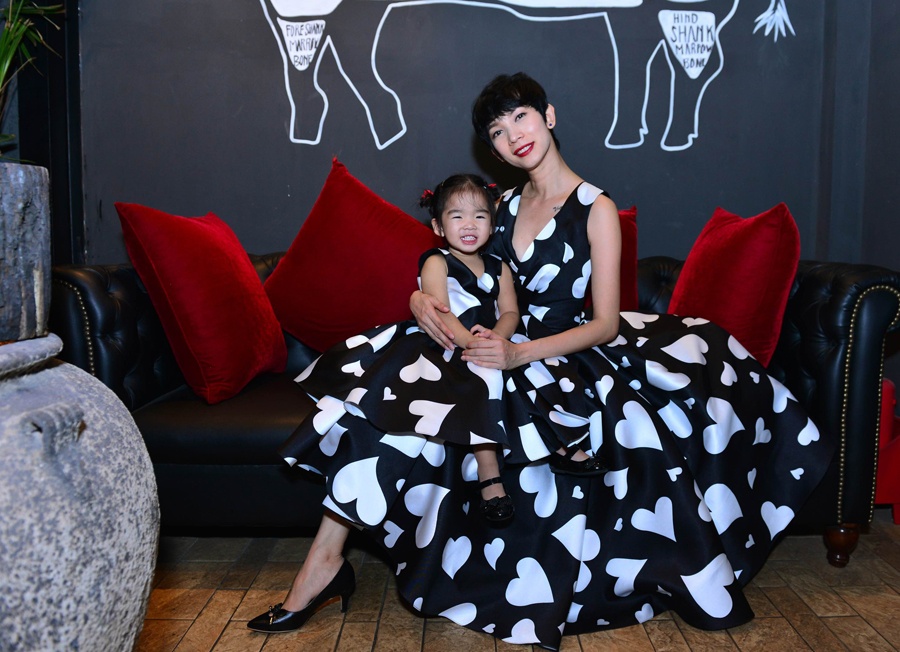 Siêu mẫu và con gái đầu lòng diện trang phục in hình trái tim đáng yêu trong tiệc sinh nhật ấm cúng.