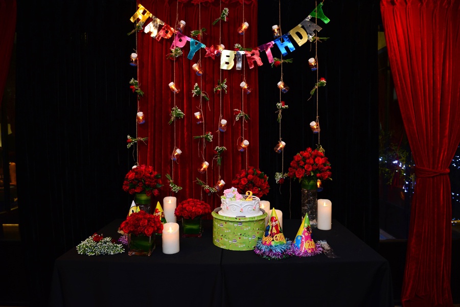 Tiệc sinh nhật của bé Thỏ được trang trí sinh động với tông đỏ chủ đạo.