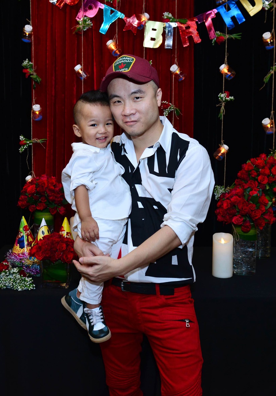 | Nhà thiết kế Đỗ Mạnh Cường, một trong những người bạn thân gắn bó với Xuân Lan từ cuộc thi Vietnam's Next Top Model, cùng con trai nuôi đến dự tiệc. |