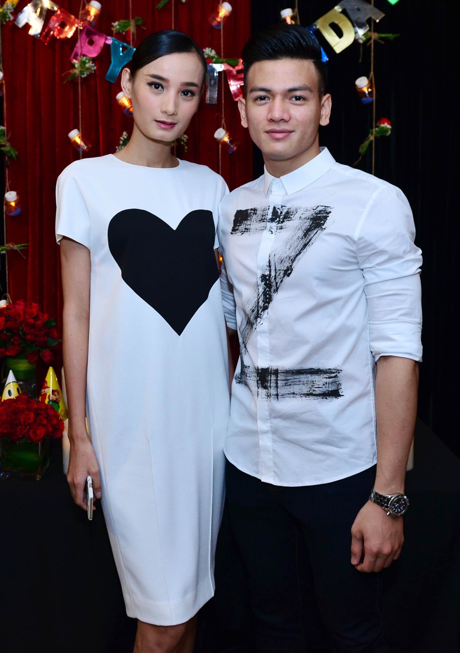 | Người mẫu Lê Thúy cùng Lê Xuân Tiền đến dự tiệc. Cặp đôi diện trang phục trắng nhã nhặn, đồng điệu. |