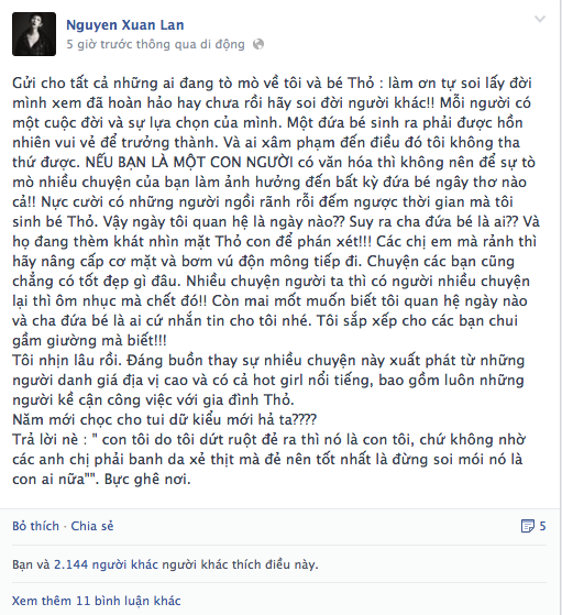Cô viết: "Gửi cho tất cả những ai đang tò mò về tôi và bé Thỏ: làm ơn tự soi lấy đời mình xem đã hoàn hảo hay chưa rồi hãy soi đời người khác! Mỗi người có một cuộc đời và sự lựa chọn của mình. Một đứa bé sinh ra phải được hồn nhiên vui vẻ để trưởng thành. Ai xâm phạm đến điều đó tôi không tha thứ được. Nếu bạn là một con người có văn hóa thì không nên để sự tò mò nhiều chuyện của bạn làm ảnh hưởng đến bất kỳ đứa bé ngây thơ nào cả.