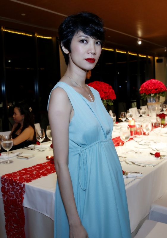 Buổi tiệc tổ chức vào tối 11/8 đã diễn ra tại tầng cao 28 của khách sạn Sheraton Nha Trang. Mặc dù đang mang thai 7 tháng nhưng Xuân Lan vẫn tỏ ra rất khỏe khoắn và năng động. Cô thoải mái di chuyển tiếp đón mọi người và cũng không ngại tạo dáng với tư thế nghịch ngợm.