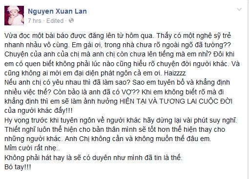 | Chia sẻ của Xuân Lan trên trang cá nhân. |