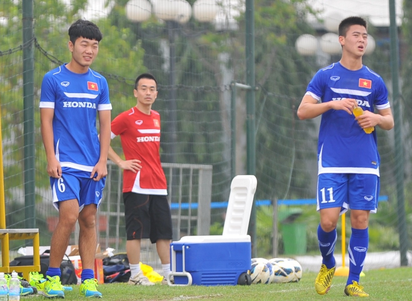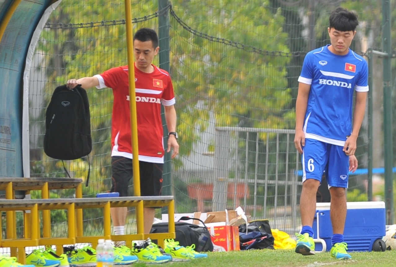 | ĐT Olympic Việt Nam có buổi tập thể lực lúc 16h chiều nay (26/2), tuy nhiên Xuân Trường đến muộn do phải cùng bác sĩ Shinichi (trái) đến bệnh viện khám lại chấn thương. |