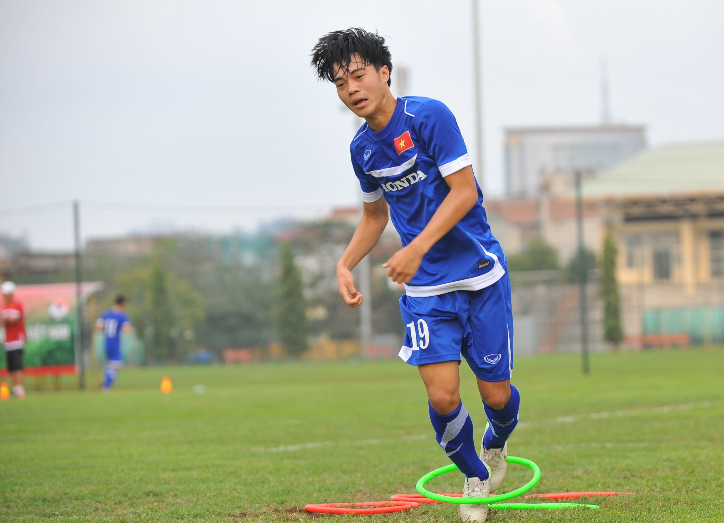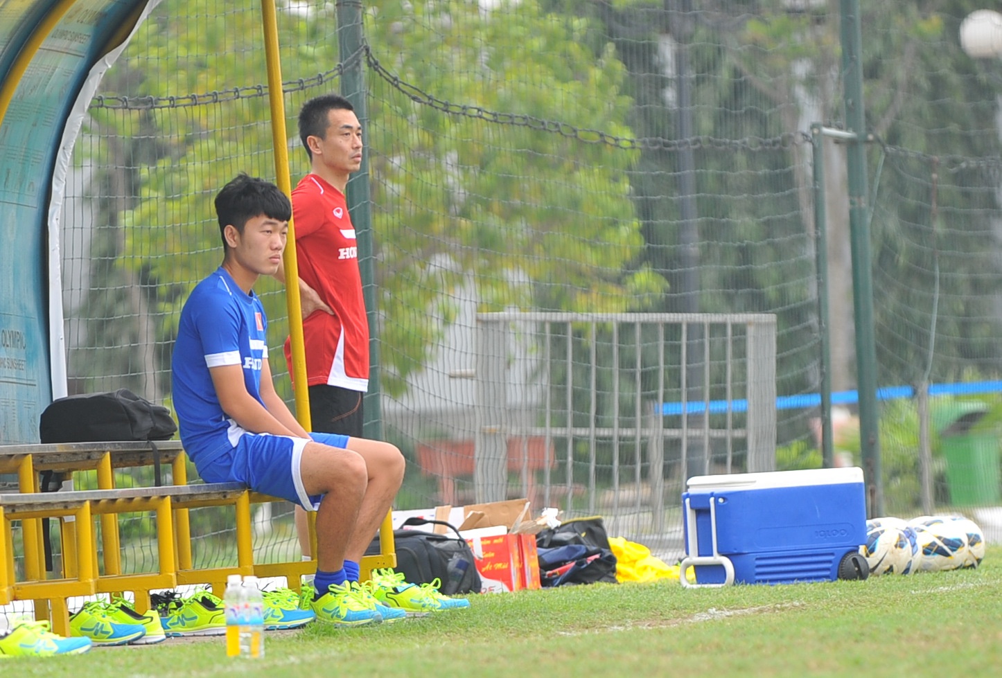 | Vẻ mặt trầm ngâm của Xuân Trường khi không được tập luyện cùng các đồng đội. |