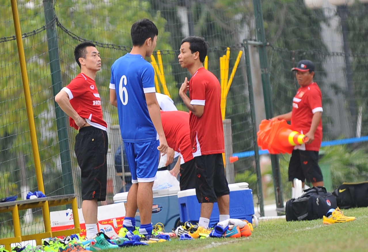 | Tiền đạo Văn Toàn nỗ lực nuốt trọn giáo án của HLV Miura. |